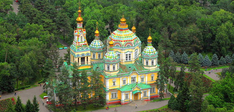 The main attraction in Almaty's Panfilov Park is the Ascension Cathedral, one of the largest wooden buildings in the world, built during early 20th century. Ethnic Russians are the chief visitors.